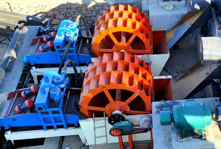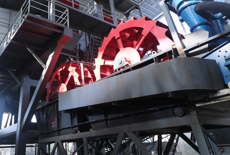 工作時,動力裝置通過三角帶、減速機、齒輪減速后帶動葉輪緩慢轉動,砂石由給料槽進入洗槽中完成清洗作用。干凈的砂石由葉片帶走,砂石從旋轉的葉輪倒入出料槽,完成砂石的清洗作用。